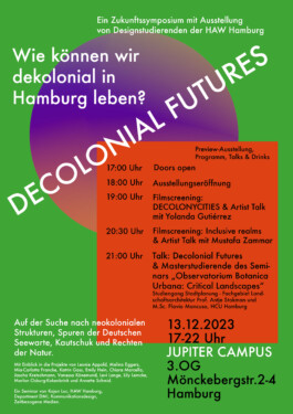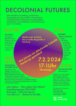 In the continuation course „Decolonial Futures“, we would like to join together as design researchers and ask (urban) design questions of tomorrow: What will the resources of the future look like in Hamburg? How can we break away from colonial practices and create climate-just alternatives? At which places of memory can we intervene and what do we remember after the climate crisis? We design speculative futures and decolonial utopias locally in Hamburg and at the same time want to understand, clarify and communicate global contexts.
